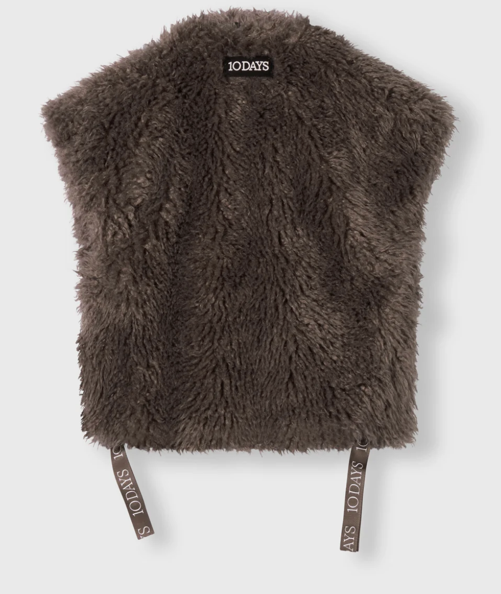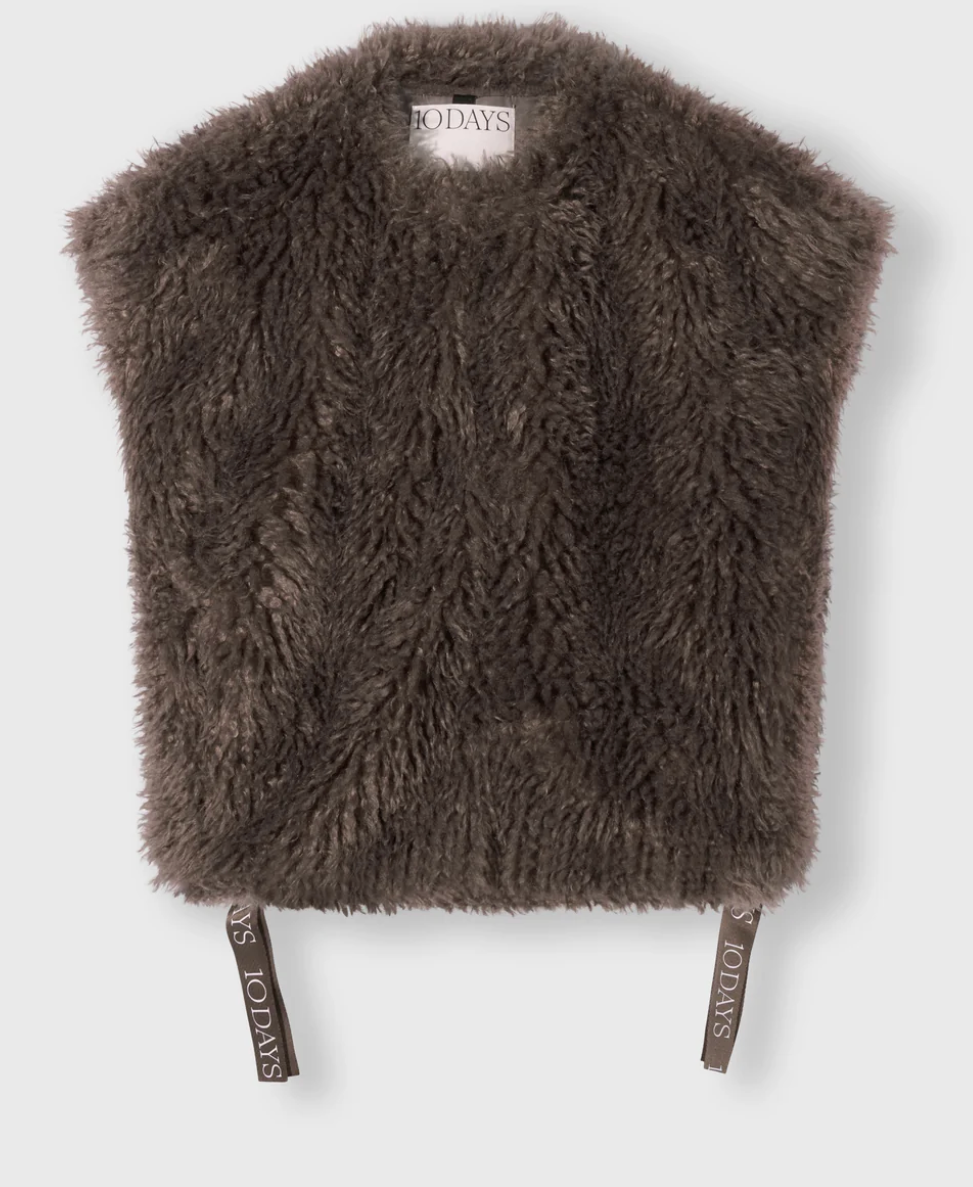 Regular Fit Hairy Gilet. Mit Rundhalsausschnitt, einem Haken- und Ösenverschluss, Eingrifftaschen, Baumwollbändern unterhalb der Seitennähte mit 10DAYS-Gummiaufdrucken und einem 10DAYS-Label auf der Rückseite.